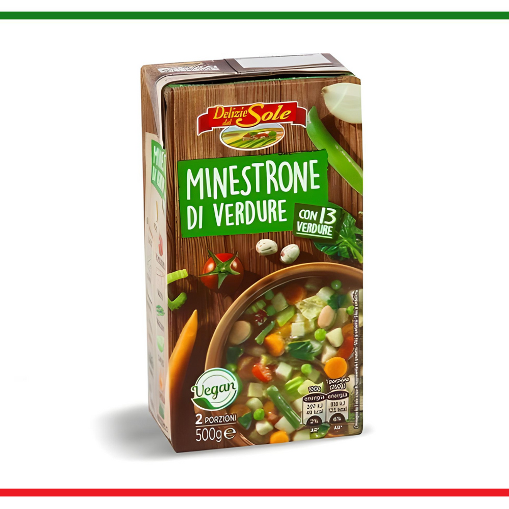 Ingrediente:Legume 56% (cartofi* 12,9%; morcovi* 11,8%; roșii* 5,3%; ȚELINĂ* 3,9%; fasole borlotti* 3,4%; dovlecei* 3,4%; fasole verde* 3,4%; mazăre* 2,8%; varză albă 2.8%.* 2%; ek* 0,85% praz verde* 0,85% patrunjel* 0,2%), apa, amidon de cartofi, ulei de masline extravirgin, sare. Valori nutriționale pentru 100 g de produs: Valoarea energetică: 207 kJ / 49 Kcal, Grăsimi: 1,4 g (din care acizi saturați 0,2 g), Carbohidrați: 6,7 g (din care zaharuri 1,1g), Fibre: 1,3 g, Proteine: 1,8G , Sare: 0,80g. A se pastra la loc uscat si racoros,ferit de razele soarelui.A se consuma de preferinta inainte de data inscrisa pe ambalaj.Tara origine: Italia.