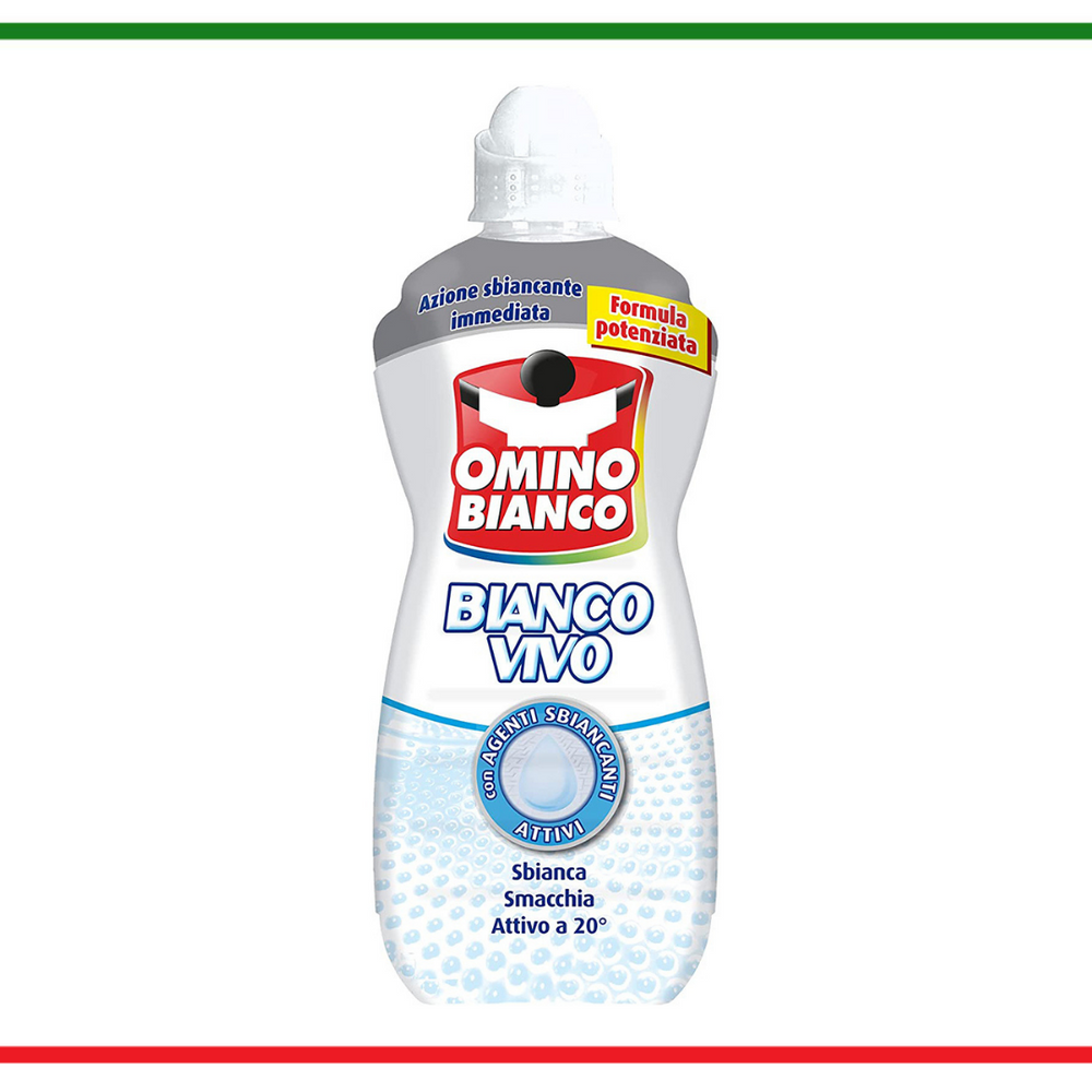 Prodotto: Omino Bianco Bianco Vivo Gel è l'additivo liquido specifico per tutti i tessuti bianchi che sbianca immediatamente e rende i capi più luminosi Azione: la sua formula migliorata con agenti sbiancanti attivi, sbianca e preserva il candore e ripristina il candore dei capi ingialliti e grigi Rispetta i tessuti: il il prodotto rispetta tutti i tessuti dal cotone ai più delicati come lana, seta, pizzo e fibre sintetiche. Utilizzo in lavatrice: aggiungere il prodotto direttamente al normale detersivo nella vasca o nel cestello di lavaggio; aggiungere una dose di Omino Bianco Vivo (100 ml) e iniziare subito a lavare. Utilizzo del lavaggio manuale: aggiungere una dose (100 ml) di prodotto al detersivo abituale in 5 litri di acqua; immergere gli indumenti e lasciarli in ammollo per 20-30 minuti