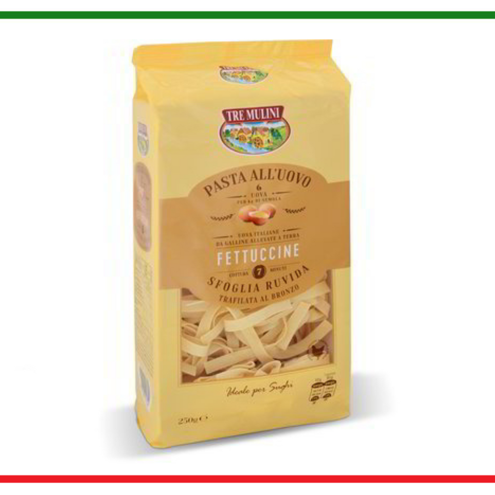Tre mulini Fettuccine all'uovo 250g pasta all'uovo Uova italiane da galline allevate a terra Pasta all'uovo - Cotta al bronzo - 6 uova per kg di semola - Ideale per