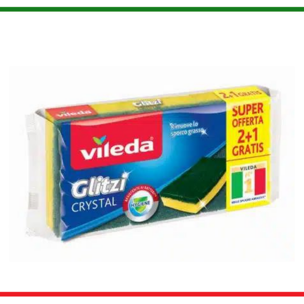 Vileda Glitzi Crystal – è la spugna ideale per ogni tipo di sporco. Ottima capacità sgrassante grazie ai frammenti di cristalli contenuti nella fibra verde abrasiva che permette la rimozione