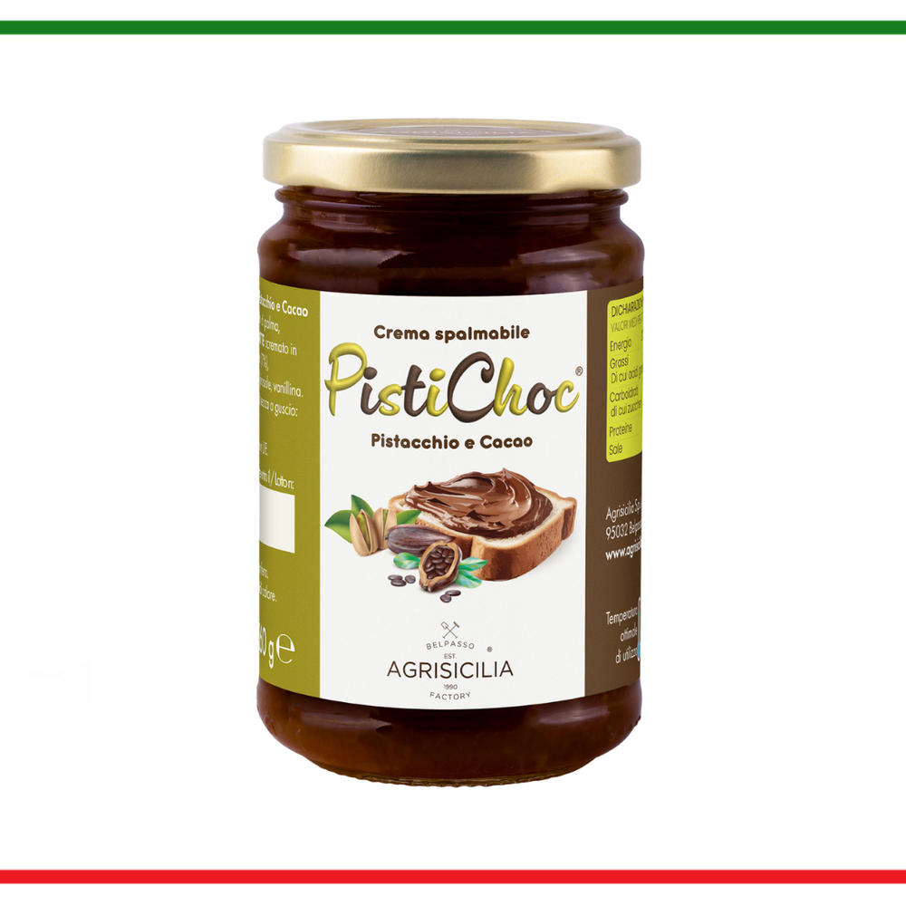 Crema tartinabilă PistiChoc cu fistic și cacao este o noutate fantastică de la Agrisicilia. În sfârșit, fisticul și cacaoa se îmbrățișează într-o combinație delicioasă. Crema de cacao și fistic PistiChoc: fericire zilnică!
