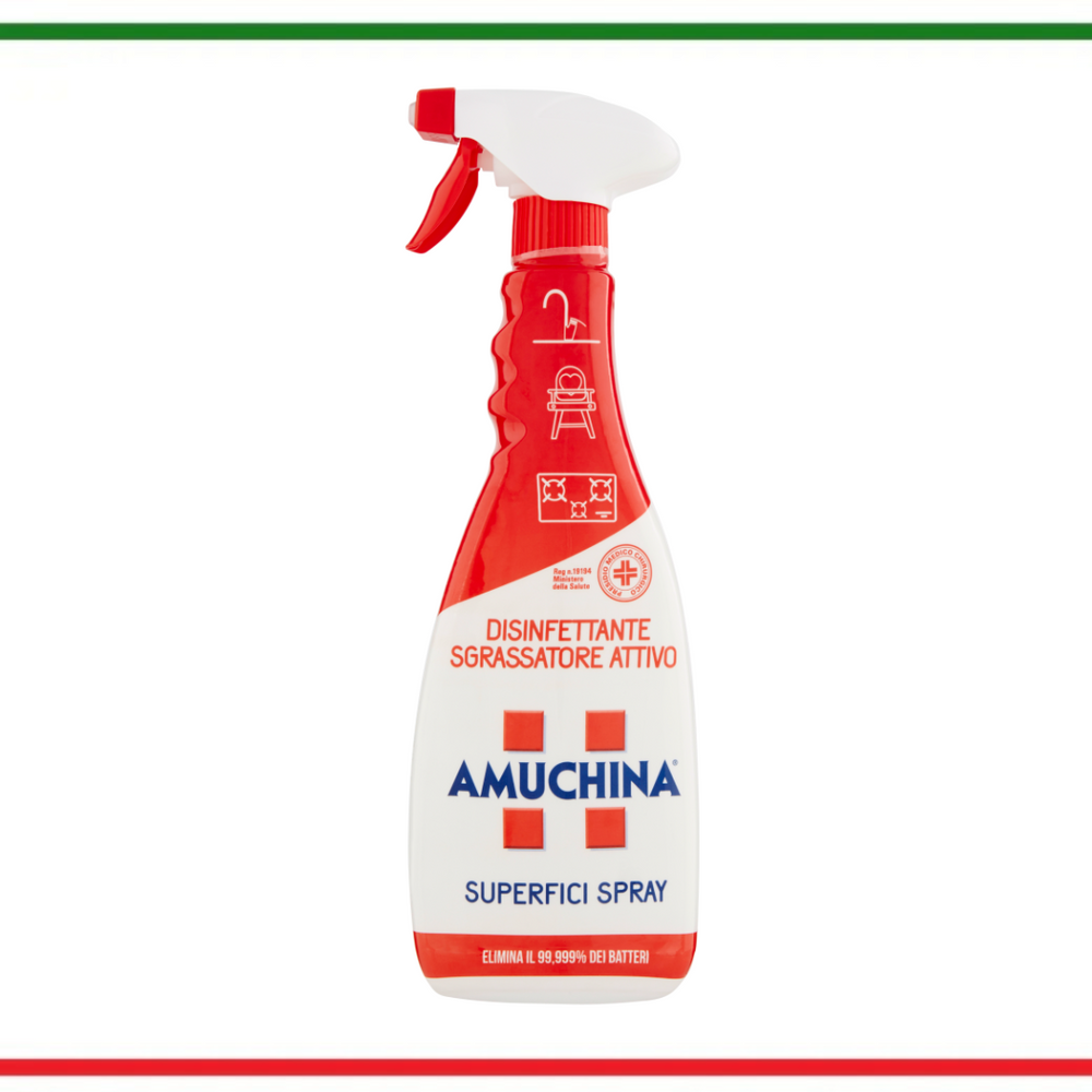Amuchina Sgrassatore Dezinfectant Dezinfectant fără clătire, este aliatul ideal pentru igiena casei tale. Indeparteaza germenii si bacterii de pe suprafata mesei ,scaune ,rafturi,noptiere. Formula sa nu lasa reziduri chimice agresive