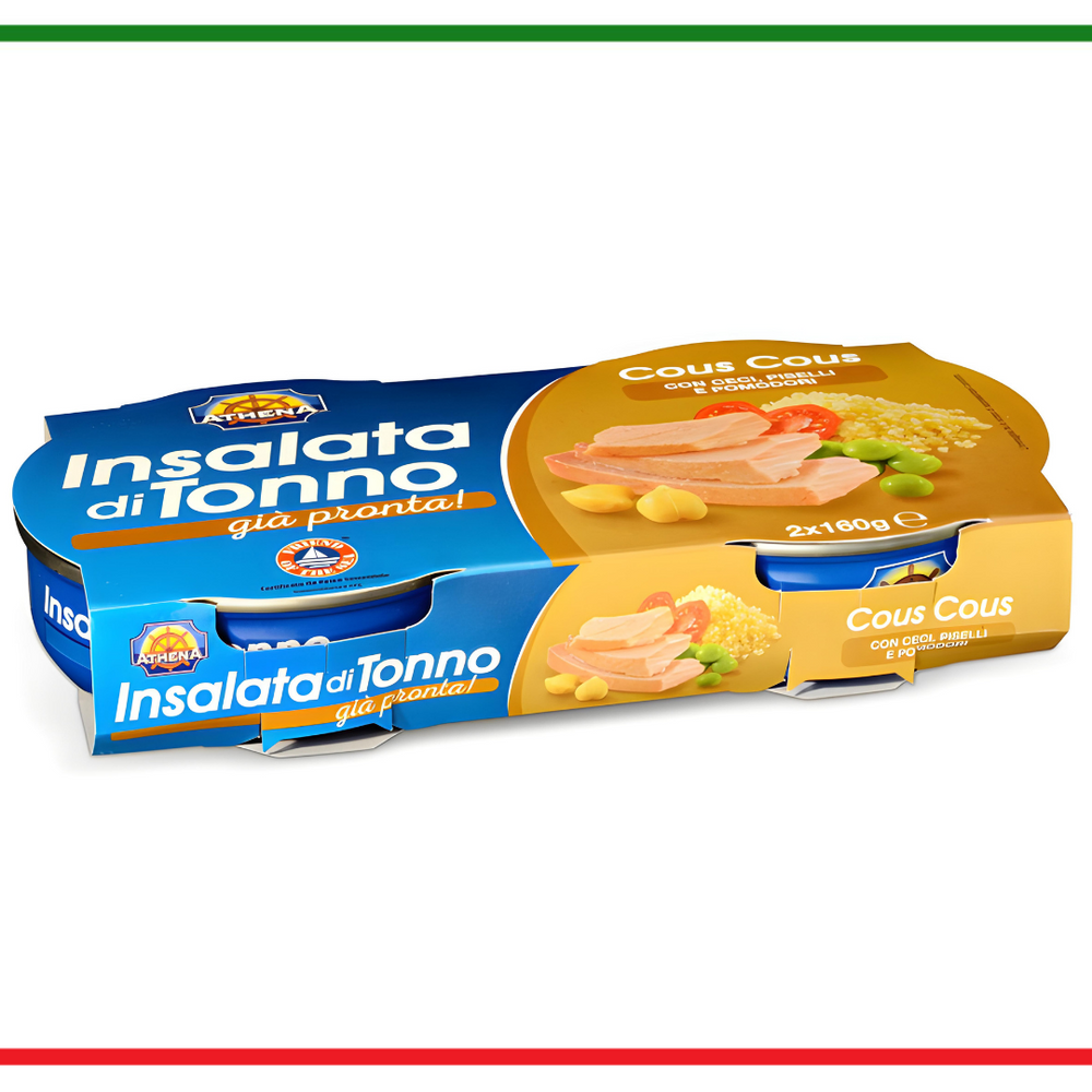 Cous cous 35% (griș de GRAU dur), ton listao 23%, ulei de floarea soarelui, naut 6%, mazare 6%, morcovi, ardei, rosii 3%, ceapa, arome naturale, sare, turmeric