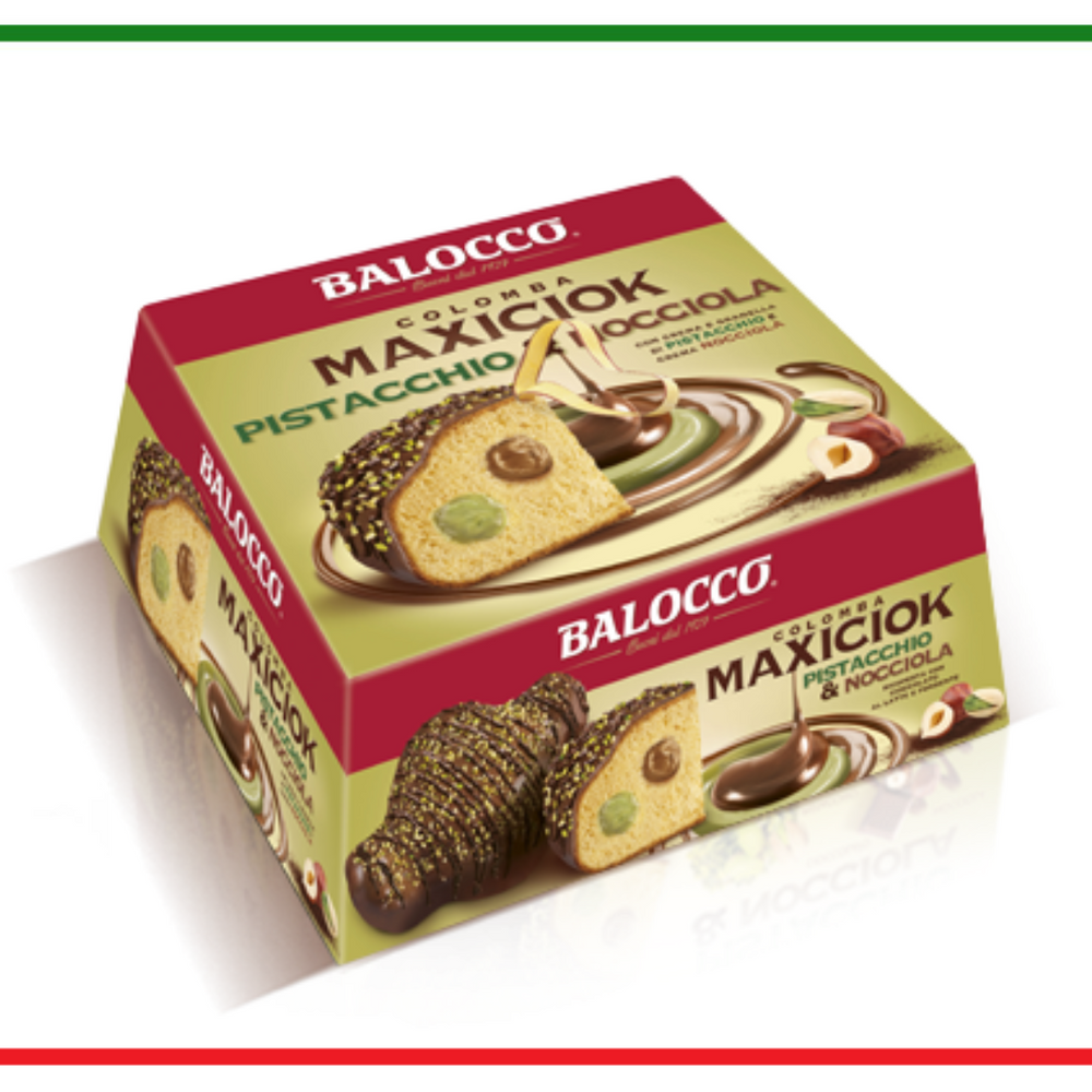Colomba umplută cu delicioase creme de fistic și alună, acoperită cu ciocolată cu lapte și ciocolată neagră, presărată cu granule de fistic caramelizat.
