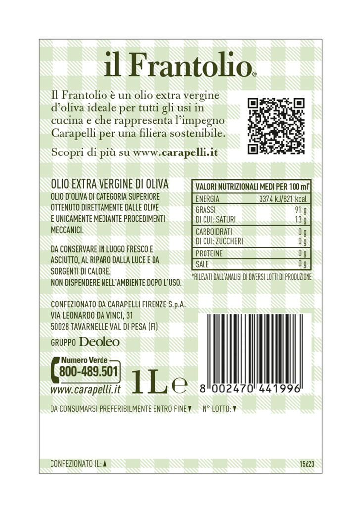 Este un ulei de măsline extravirgin obținut la rece, cu un gust echilibrat care îl face ideal pentru toate utilizările zilnice în bucătărie. La fel ca și celelalte uleiuri extravirgin Carapelli, Il Frantolio respectă parametri chimico-fizici mai restrictivi decât cei prevăzuți de lege, pentru a-i garanta calitatea și prospețimea până la expirare. Consultați eticheta pentru mai multe informații. Ambalat într-o sticlă de sticlă verde închis, produsă cu până la 85% sticlă reciclată, de astăzi Il Frantolio este reînnoit în numele durabilității: calitatea obișnuită, acum sporită cu o certificare importantă a producției din agricultură durabilă care mărturisește respectarea strictă a mediului. , parametrii sociali, economici și de calitate, pe lângă angajamentul nostru față de dezvoltarea categoriei.