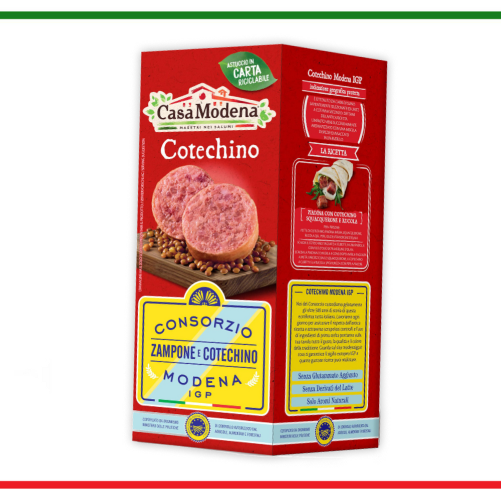 Indicație geografică protejată Cotechino Modena IGP Se obține din carne de porc selectată în mod expert și combinată cu coaja conform dictatelor rețetei antice. Lucrăm în fiecare zi pentru a asigura respectarea rețetei antice și prin controale scrupuloase și utilizarea ingredientelor de primă alegere aducem la masa ta tot gustul, calitatea și căldura tradiției. Glutamat gratuit adăugat fără derivați de lapte numai arome naturale fără gluten