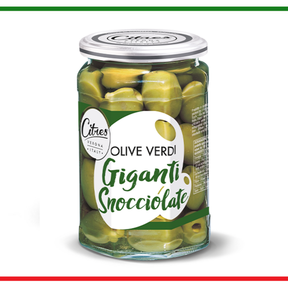 Măsline 100% italiene, soiul Bella di Cerignola, pulpoase și crocante.DECLARAȚIE NUTRIȚIONALĂ Valori medii pentru 100 g produs scurs VALOAREA ENERGETICĂ Kcal138 Grasime g13 din care acizi grași saturați g2.5 Glucide g1.3 din care zaharuri g0.0 fibre g4.0 Proteine g1 Sare g2.7
