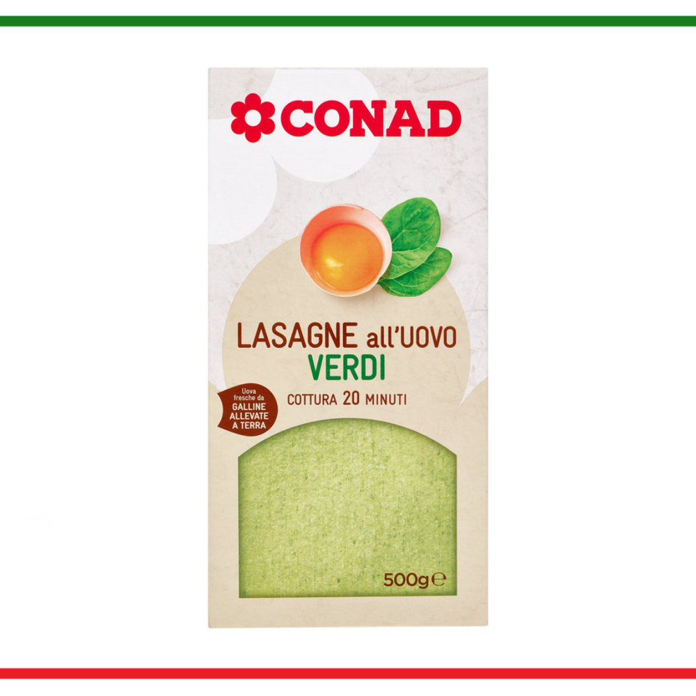 Lasagna verde Conad este preparată conform rețetei tradiționale din Emilia, utilizând ouă proaspete și semolă de grâu dur. Culoarea distinctivă provine de la spanacul deshidratat. Toate ingredientele utilizate sunt de cea mai bună calitate. Selectăm cu grijă producătorii și preferăm grâul italian, pentru a sprijini produsele locale și pentru a face procesul de producție mai sustenabil. Aluatul de lasagna Conad conține 51% grâu italian.