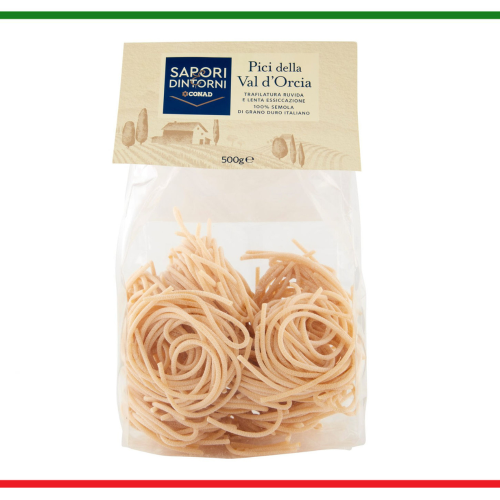 Adu în bucătărie aromele tradiției culinare toscane cu pici din Val d'Orcia din linia Sapori e Dintorni. Tipici pentru bucătăria din Siena, piciii își trag numele din cuvântul „appiccicare”, care face referire la modul în care sunt făcuți pentru a obține un spaghetti lung și cu grosime neregulată. Folosește-i pentru a prepara una dintre cele mai faimoase rețete tradiționale, care îi vrea condimentați cu un sos pe bază de pesmet, ulei și usturoi. Sau impresionează papilele gustative ale celor mari și mici servindu-i cu sosuri mai bogate și complexe. Cu pici din Val d'Orcia poți regăsi gusturile uneia dintre cele mai cunoscute și iubite regiuni italiene în întreaga lume.