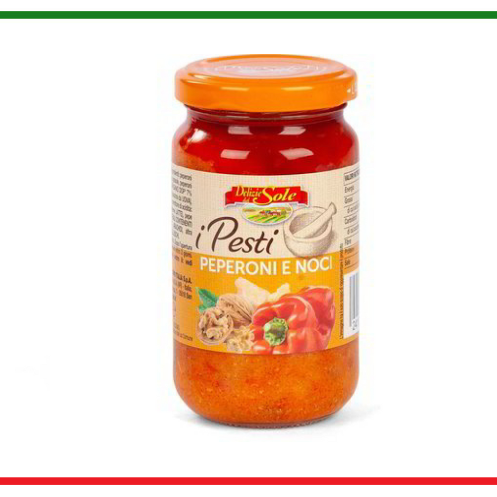 Ingrediente:ardei (rosu si galben) 31%, ulei de floarea soarelui, ardei gratar 20%, branza "GRANA PADANO DOP" 7% (LAPTE; sare; cheag; conservant: lizozim din oua), fulgi de cartofi, NUCI 2,9%, sare, aciditate regulator: acid lactic, arome naturale (contine LAPTE), piper negru.Ingredientele evidențiate pot provoca reacții la persoanele alergice sau intolerante.Valori nutritionale pentru 100g de produs: Valoarea energetica:1292 kJ /313 kcal ; grasimi:30g (din care acizi saturati 4.7g) carbohidrati:5.6g (din care zaharuri 3.4g); Proteine:5.1g; Fibre:1.6g,Sare 2.7g. A se pastra intr-un loc uscat si racoros,ferit de razele soarelui.A se consuma de preferinta inainte de data inscrisa pe ambalaj.Tara origine: Italia.