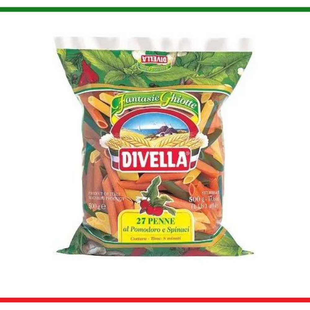 Inca din anul 1890, compania de succes Divella produce paste din grau dur de cea mai buna calitate, ideale pentru o alimentatie echilibrata. Gama contine peste 150 de forme de paste ce satisfac cerintele celor mai pretentiosi consumatori. De la spaghete, rigatoni, paste cu oua, integrale si pana la sortimentele imbogatite cu legume deshidratate, producatorul sustine traditia italiana si propune o varietate de produse. Penne tricolore de la Divella sunt paste imbogatite cu spanac si rosii, un sortiment gustos din care puteti obtine preparate originale si atragatoare.