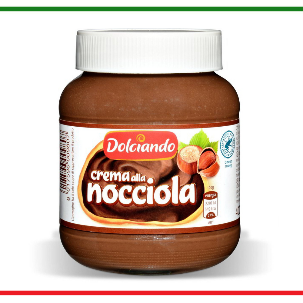 Dolciando Cremă Ciocolată - 750gr Dolciando Crema Cioccolato Crema de ciocolata tartinabila cu alune de padure . Ingrediente: zahar, uleiuri vegetale (palmier, floarea-soarelui), alune 13%, pudră de cacao cu conținut