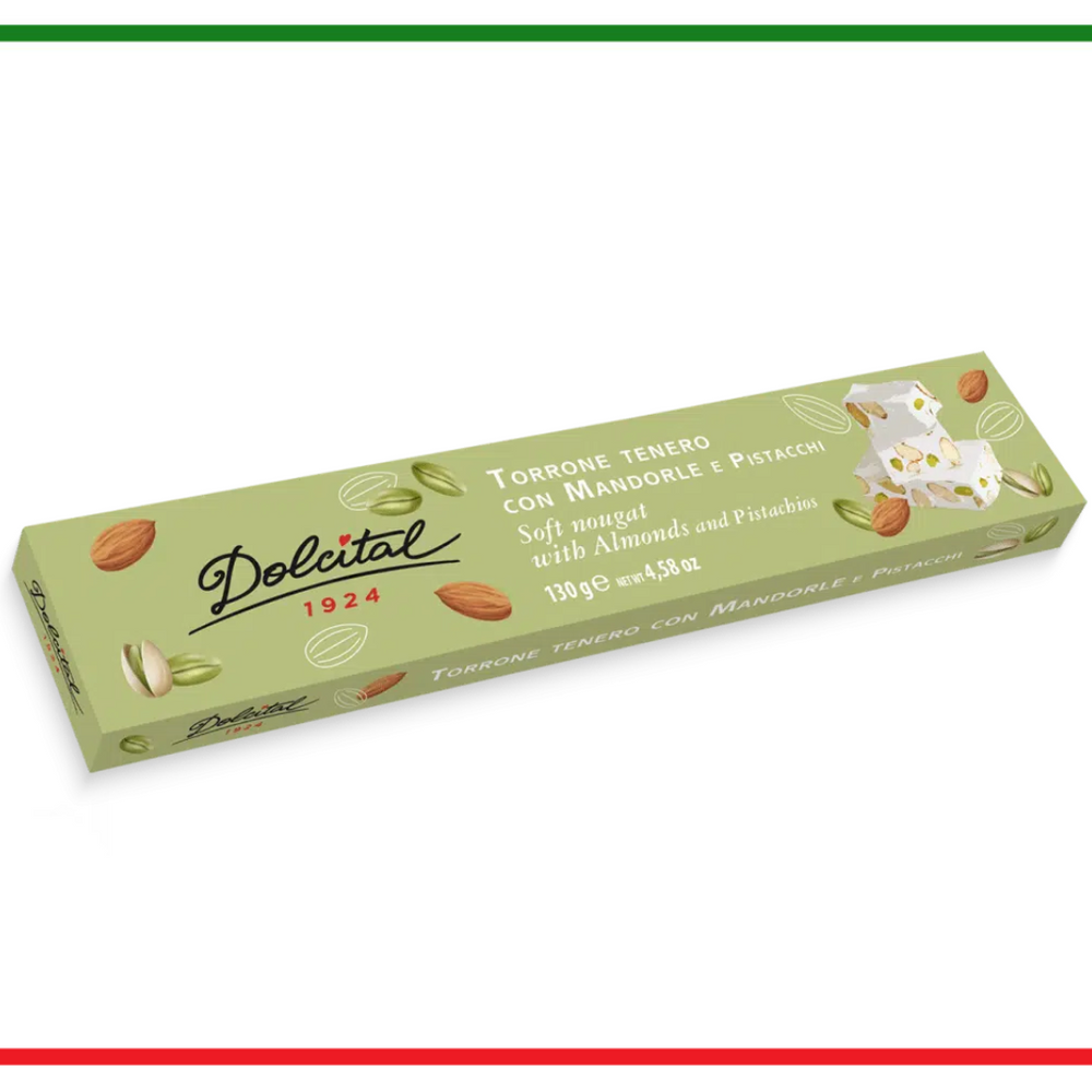 Moale, cu migdale și fistic.Crocantul migdalelor naturale, aroma fisticului prăjit, unicitatea întâlnirii lor.Un cadou special din Italia, ambalat într-o cutie colorată.