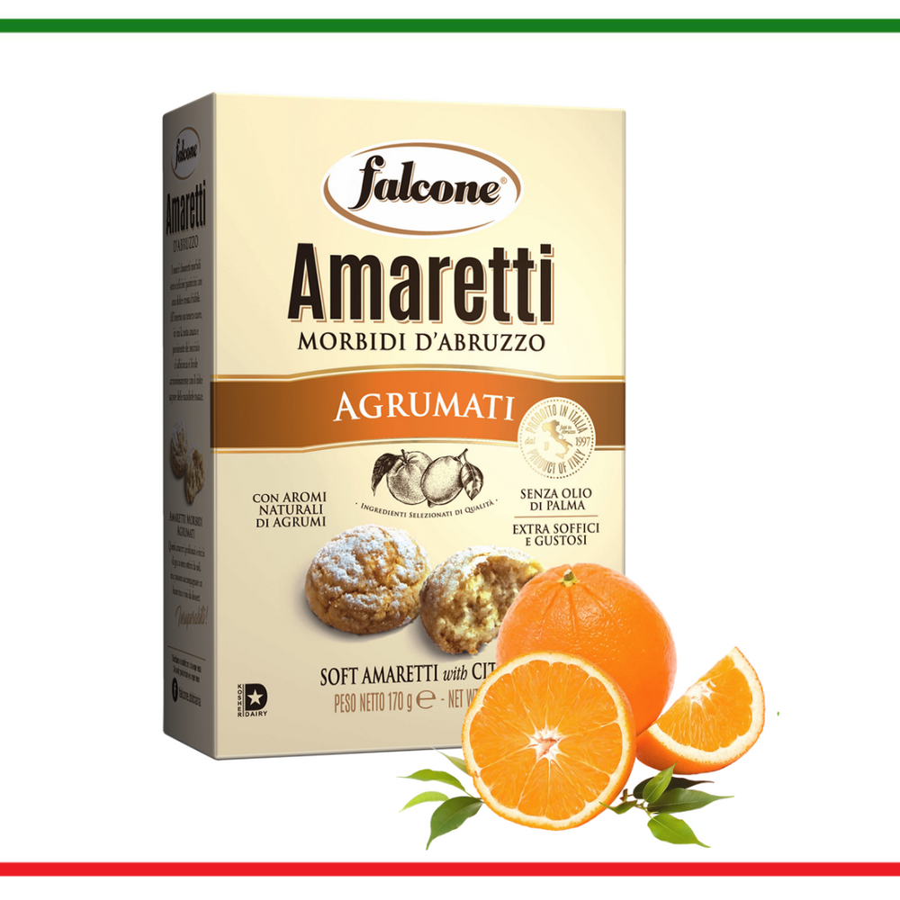 Ingredientele selectate, de calitate, stau la baza amaretti moale de citrice de la Falcone, un produs tipic italian de care te poti bucura la micul dejun, ca gustare sau dupa