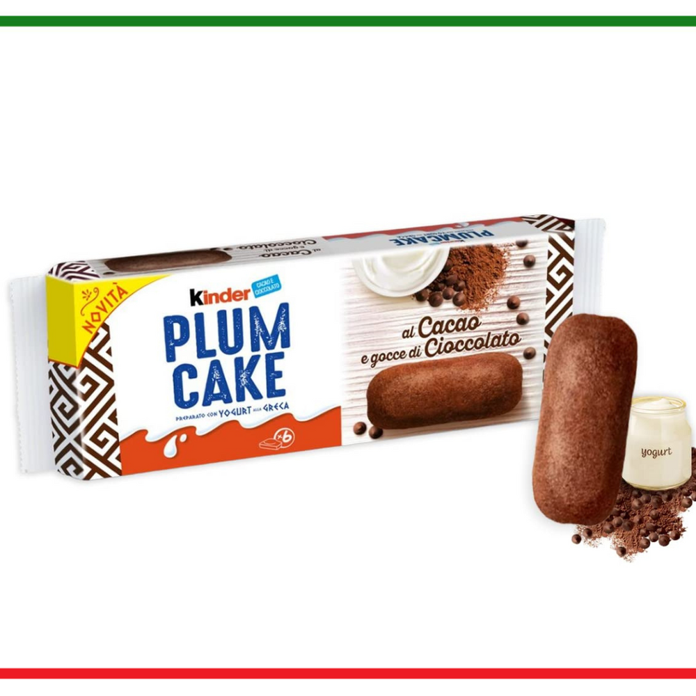 Kinder Plumcake cu Cacao si Bucati de Ciocolata - briose cu cacao si bucati de ciocolata pregatite in cuptor. Ingrediente: faina de GRAU, zahar, OUA, ulei de floarea soarelui, ciocolata extra 9%, LAPTE neddegresat praf 2%, arome, agenti de crestere, emulsificatori, sare, amidon din GRAU. Pot contine SOIA si alte FRUCTE in COAJA. Gramaj: 6 buc 198gr.