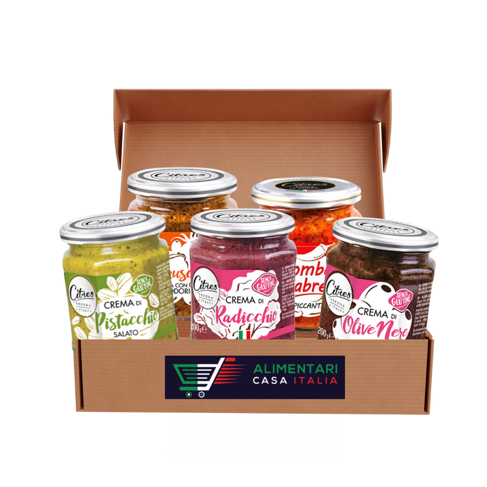 setul contine: -Citres sos măsline negre 200g fără gluten-Citres crema de fisic sarat 200g-Citres sos bomba calabrese 200g fără gluten-Citres sos bruschetta 200g fără gluten-Citres sos ridiche 200g Imaginea este
