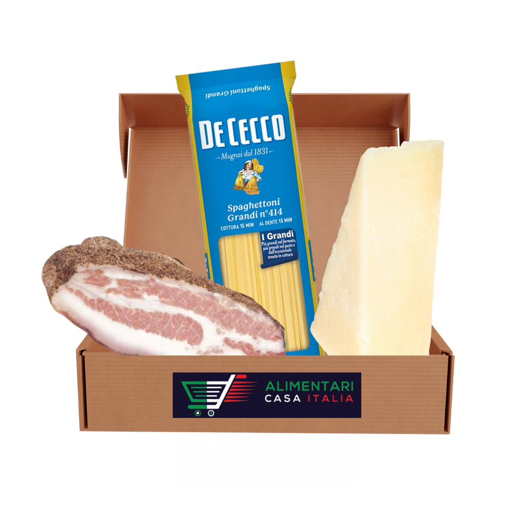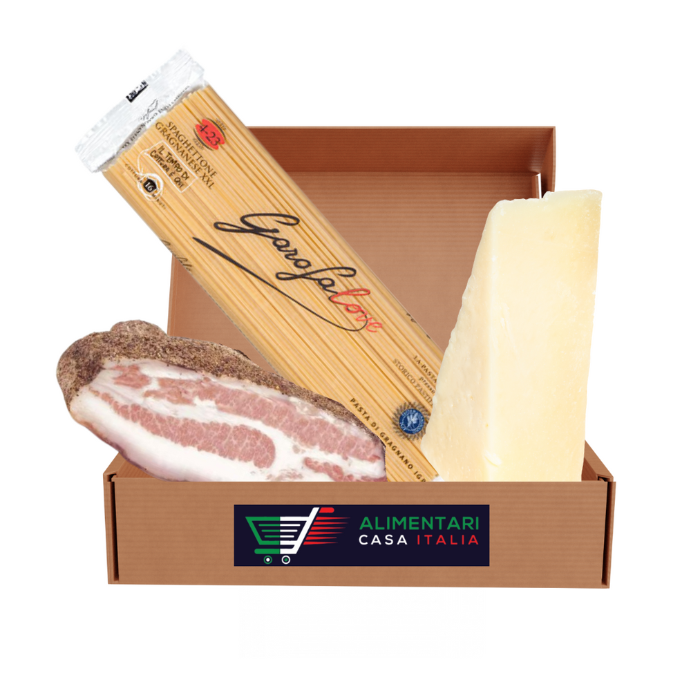 Kit perfect pentru a pregăti o carbonara delicioasă! include un pachet de 500 g de Garofalo/De Cecco Spaghetti, o bucată de guanciale Brugnolo* (aproximativ 100g) si o bucata de Pecorino Romano* (aproximativ 100g)