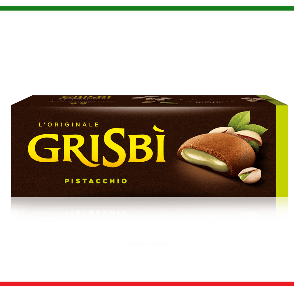 Biscuiți Grisbi Fistic - biscuiți italieni ușori și crocanți, cu umplutură de cremă de fistic. 150 g Grisbi Produs al Italiei Ingrediente: Făină de grâu, zahăr, uleiuri vegetale de palmier și floarea soarelui, sirop de glucoză, ouă, lapte praf integral, pastă de fistic 5% în smântână, amidon de porumb, amidon de grâu, zer praf (lapte), cacao, gălbenuș de ou praf, sare, Lecitină de floarea soarelui, extracte vegetale de lămâie, șofran, spirulina, măr, agenți de creștere (carbonat acid de sodiu, carbonat acid de amoniu), arome. Poate contine arahide, soia si alte nuci.