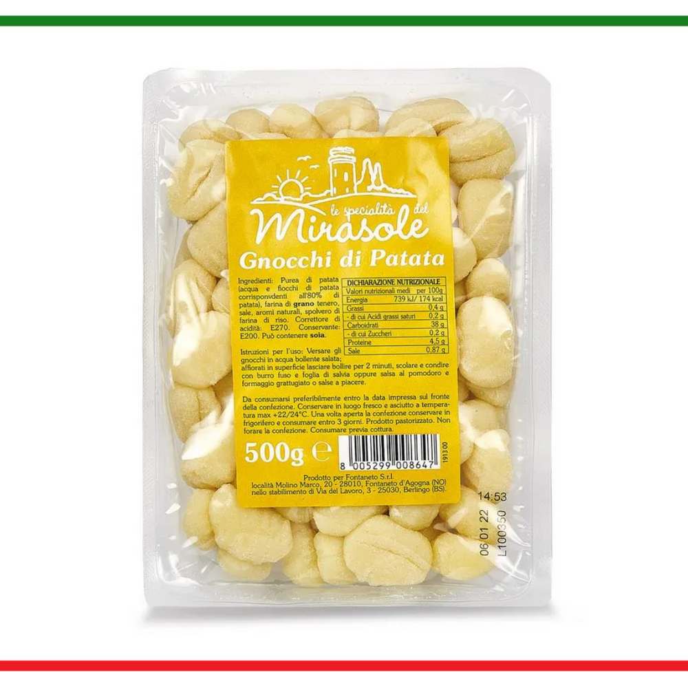 INGREDIENTE: Piure de cartofi (apa, frunze de cartofi si fecula corespunzatoare 80% cartofi), harina neteda TRIGO, sare, arome naturale, pudrata cu harina prajita. Regulator de aciditate: E270. Conservant: E200. Valori nutriționale pentru 100 g de produs: Valoarea energetică: 174 kJ / 739 kcal, Grăsimi: 13,8g (din care acizi saturați 0,2g), Carbohidrați: 38g (din care zaharuri 0,2g), Fibre: 0 g, Proteine: 4,5G , Sare: 0,87g. A se pastra la loc uscat si racoros,ferit de razele soarelui.A se consuma de preferinta inainte de data inscrisa pe ambalaj.Tara origine: Italia.