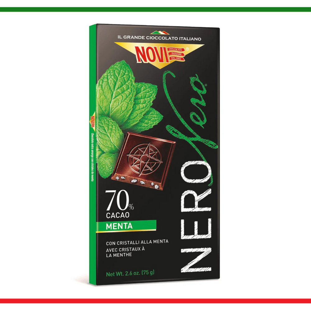 Ingrediente: Masa de cacao, zahar, unt de cacao, cristale de zahar caramelizat de menta (zahar, sirop de glucoza, ulei esential de menta) (13%), cacao slaba, arome naturale. Cacao: minim 70% în ciocolată extra neagră. Poate contine urme de lapte, alune, migdale si soia . Valori nutriționale pentru 100 g de produs: Valoarea energetică: 2440 kJ / 588 kcal, Grăsimi: 45g (din care acizi saturați 27g), Carbohidrați: 34G(din care zaharuri 29G), Fibre: 0 g, Proteine: 7,8G , Sare: 0G. A se pastra la loc uscat si racoros,ferit de razele soarelui.A se consuma de preferinta inainte de data inscrisa pe ambalaj.Tara origine: Italia.