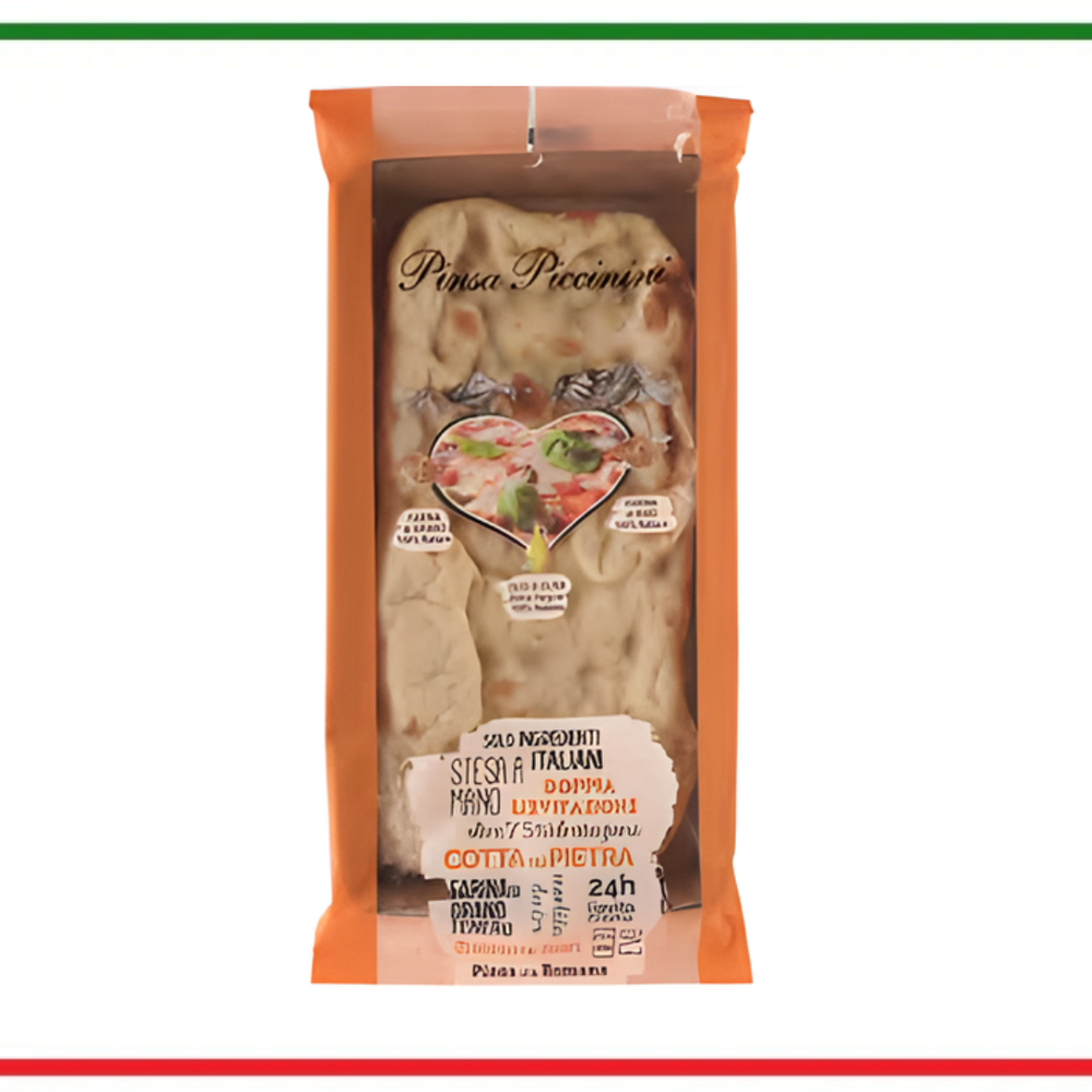 Făină de GRÂU moale tip „0”, apă, făină de orez, ulei de măsline extravirgin, ulei de floarea soarelui, făină de GRÂU moale tip „2” măcinată pe piatră, maia uscată (conține GRÂU), sare,
