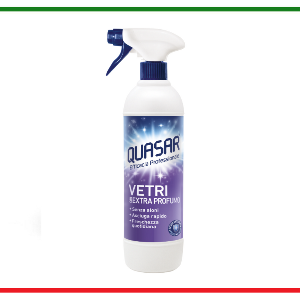 Spray-ul Quasar Glass cu Extra Parfum indeparteaza eficient murdaria, facand sticla, cristalele si oglinzile sa straluceasca fara a lasa urme sau dungi.Formula sa, imbogatita cu Extra Parfum, garanteaza prospetimea zilnica