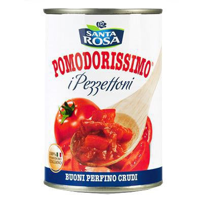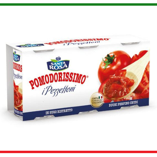 Pezzettoni Pomodorissimo sunt cu adevărat speciale, ideale pentru asezonarea cu gust și simplitate: doar cele mai bune roșii italiene, tăiat în bucăți mari, intr-un sos gros si gustos. O plăcere atât de perfectă încât este suficientă un strop de ulei crud pentru a spune „Este gata!”. INGREDIENTE Roșii tăiate cubulețe, suc de roșii, sare de gătit